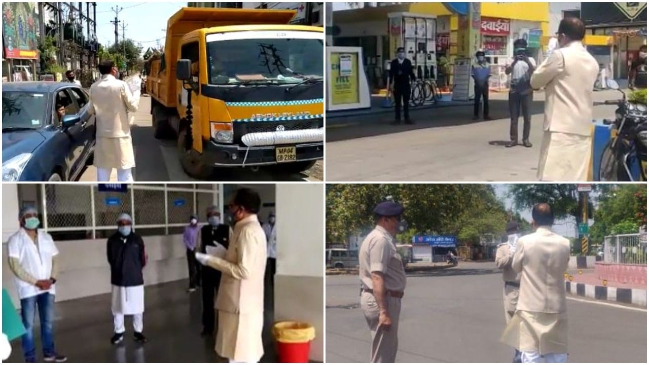 मुख्यमंत्री शिवराज सिंह चौहान ने आज भोपाल की सड़कों पर निकलकर स्वास्थ्य कर्मी, पुलिसकर्मी और निगम कर्मियों को धन्यवाद दिया और प्रेरणा दी के आप इसी तरह जन सेवा में लगे रहिए । साथ ही मुख्यमंत्री ने दवा, सब्जी और किराने की दुकान में पहुंचकर लोगों से सोशल डिस्टेंस बनाए रखने की अपील की ।