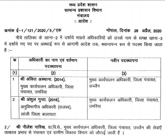 आदेश के मुताबिक दो आईएएस अधिकारियों के तबादले किये हैं| अंकित अस्थाना सीईओ, जिला पंचायत उमरिया को सीईओ, जिला पंचायत उज्जैन पदस्थ किया गया है| वहीं अंशुल गुप्ता अनुविभागीय अधिकारी, (राजस्व ) लांजी, जिला बालाघाट को मुख्य कार्यपालन अधिकारी जिला पंचायत उमरिया पदस्थ किया है| इसके अलावा नीलेश पारिख मुख्य कार्यपालन अधिकारी जिला पंचायत उज्जैन की सेवाएं पंचायत एवं ग्रामीण विकास विभाग को वापस लौटाई गई हैं|