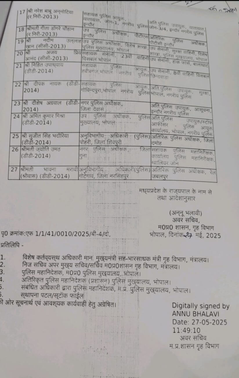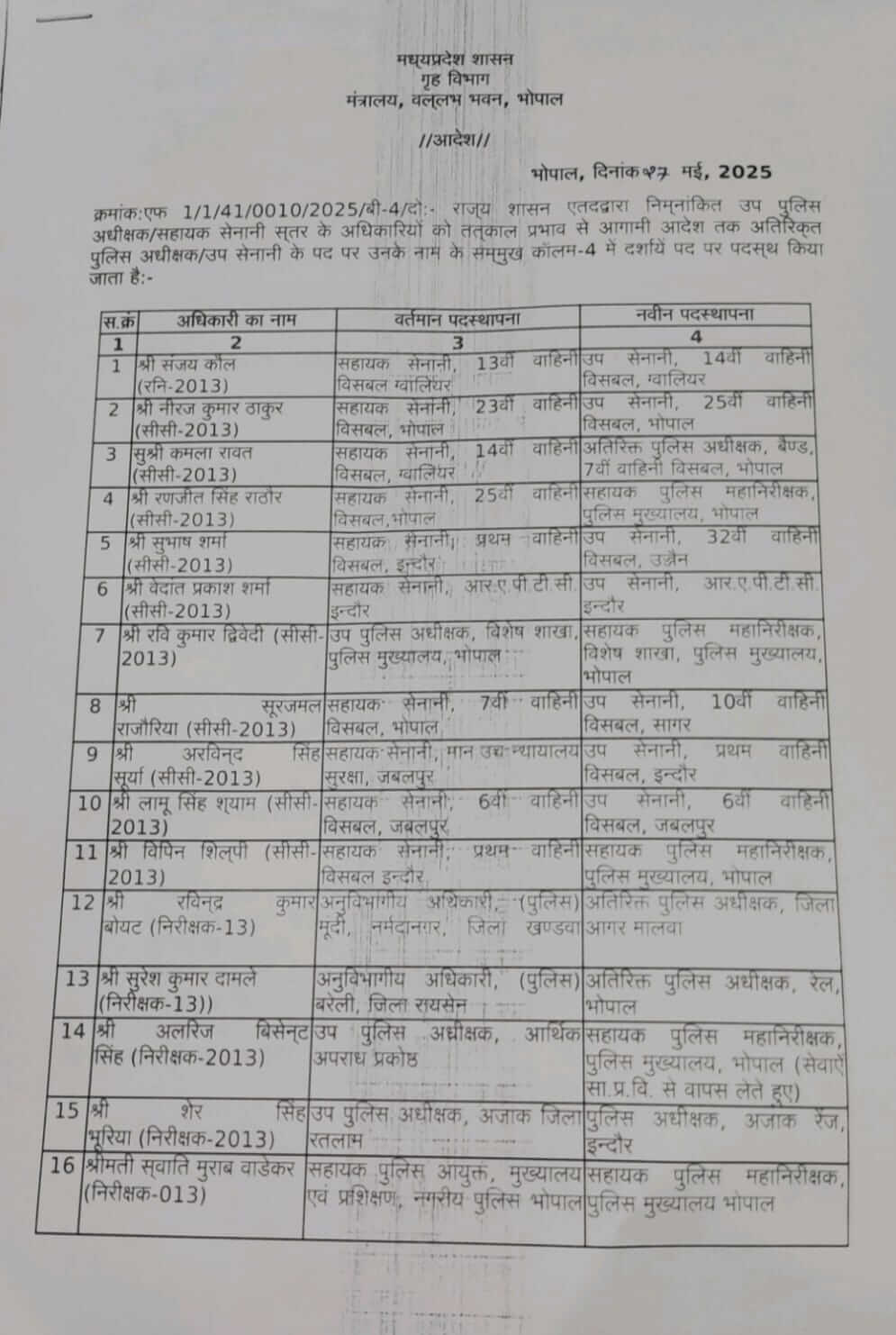 मध्य प्रदेश में अधिकारियों, कर्मचारियों के तबादला आदेश जारी करने का क्रम जारी है, सभी विभाग तबादलों की समय सीमा 30 मई से पहले ट्रांसफर लिस्ट फ़ाइनल करने में लगे हैं, इसी बीच विभाग अधिकारियों की पदोन्नति आदेश भी जारी कर उन्हें एक जगह से दूसरी जगह पदस्थ कर रहे हैं।
