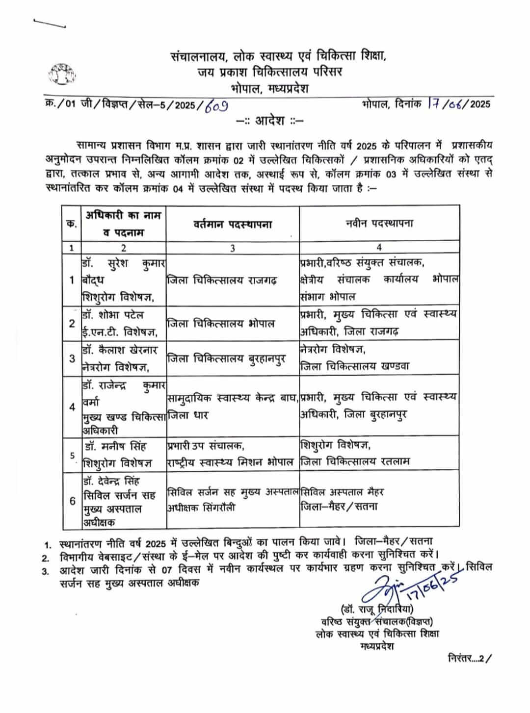 संचालनालय से जारी चिकित्सा अधिकारियों की सूची में कुल 89 चिकित्सा अधिकारियों के तबादले किये गए हैं इन्हें एक जिले से दूसरे जिले में पदस्थ किया गया है, इसी तरह संचालनालय ने 6 चिकित्सा अधिकारियों की मुख्य चिकित्सा एवं स्वास्थ्य अधिकारी के पद पर पदस्थापना की है।