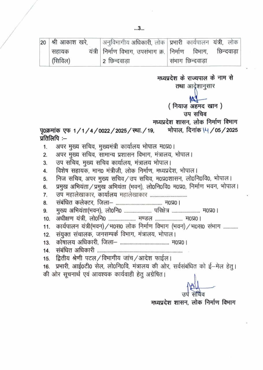 PWD ने जो तबादला सूची जारी की है उसमें 20 इंजीनियर्स के नाम है जो कार्यपालन यंत्री, सहायक यंत्री स्तर के अधिकारी हैं, सूची में शामिल 20 इंजीनियर में 2 कार्यपालन यंत्री और 18 सहायक यंत्रियों के नाम शामिल हैं।