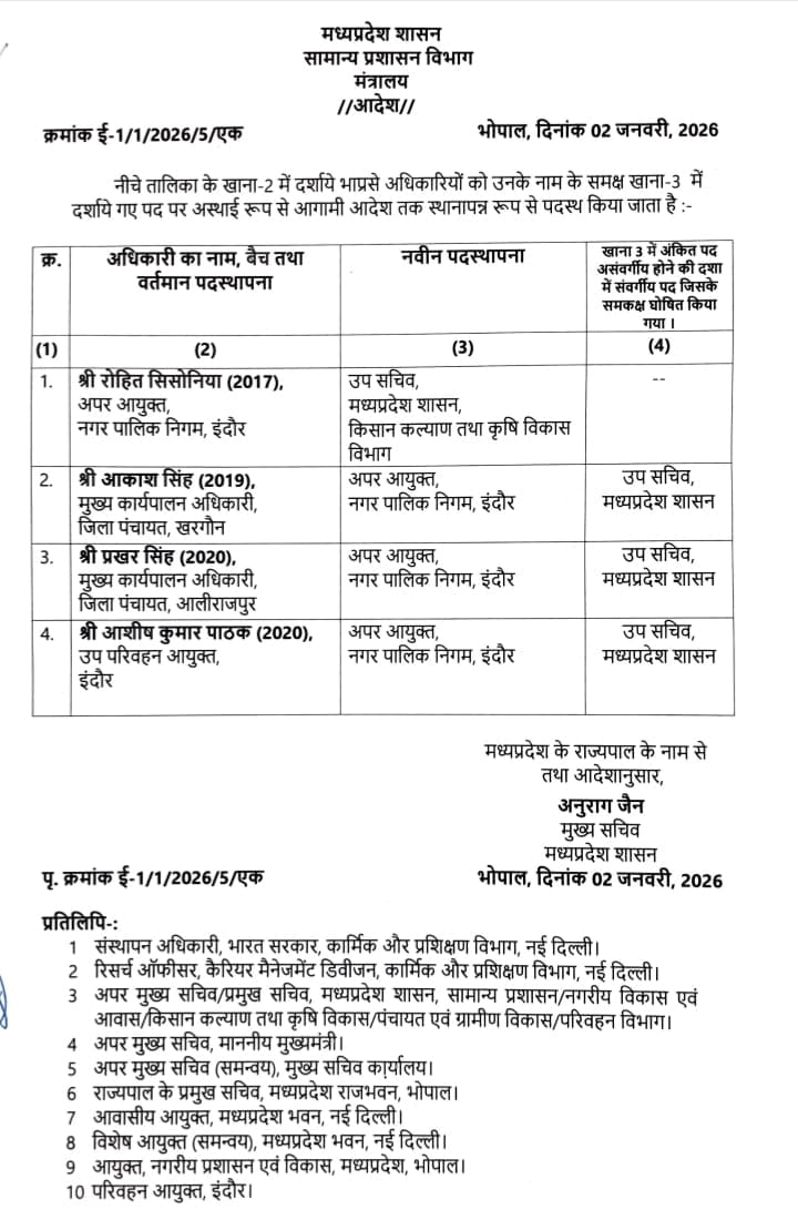 मुख्यमंत्री डॉ मोहन यादव के निर्देशों का असर तत्काल हुआ है, शासन ने अपर आयुक्त रोहित सिसोनिया को इंदौर से हटा दिया है, सामान्य प्रशासन विभाग ने तबादला आदेश जारी कर दिए हैं, GAD ने आज कुल 4 आईएस अधिकारियो की तबादला सूची जारी की हैं इसमें एक अधिकारी को इंदौर से हटाया गया है और तीन अधिकारियों को अपर आयुक्त नगर निगम बनाकर पदस्थ किया है।