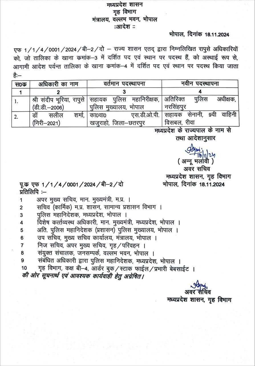 गृह विभाग के आईपीएस अधिकारियों के अलावा राज्य पुलिस सेवा के दो अधिकारियों को भी इधर से उधर किया है इसमें पुलिस मुख्यालय भोपाल में पदस्थ एआईजी संदीप भूरिया को एडिशनल एसपी नरसिंहपुर पदस्थ किया है और कार्यवाहक एसडीओपी खजुराहो जिला छतरपुर डॉ सलील शर्मा को डिप्टी कमान्डेंट 9 वीं बटालियन रीवा पदस्थ किया है ।