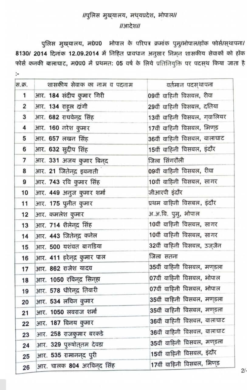 रीवा , दतिया, ग्वालियर, भिंड, बालाघाट, इंदौर, सागर उज्जैन, मंडला, भोपाल और छिंदवाड़ा की अलग अलग एसएएफ वाहनियों में पदस्थ और सिंगरौली, सतना व भोपाल जिला इकाई में पदस्थ पुलिस आरक्षकों को पुलिस मुख्यालय ने प्रतिनियुक्ति पर 5 साल के लिए हॉक फोर्स में भेजा है।
