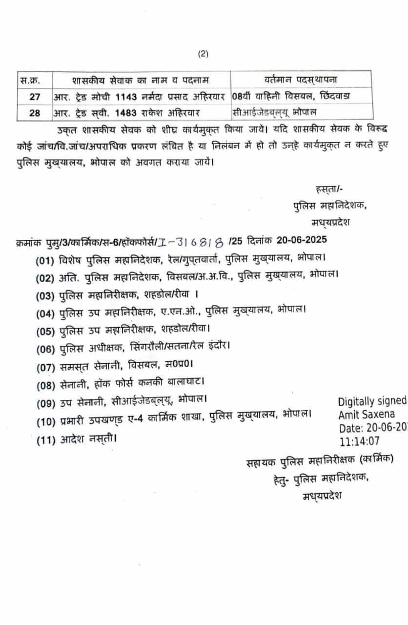 पुलिस मुख्यालय भोपाल का आदेश