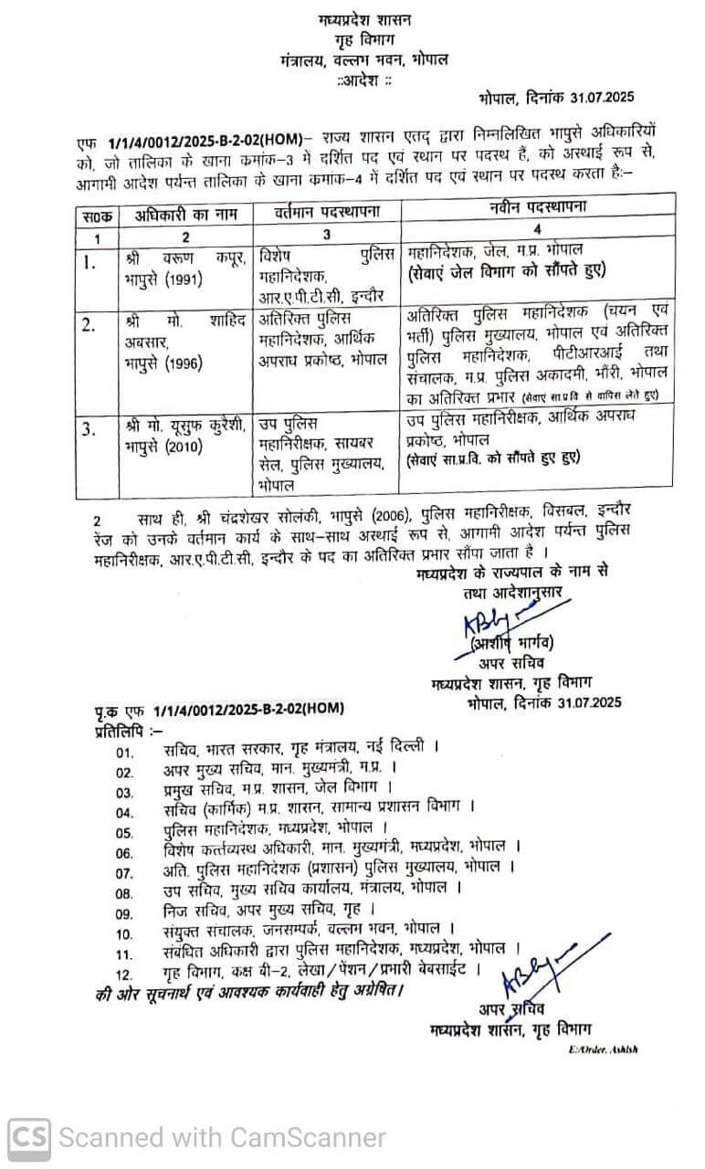 तबादला आदेश में IPS वरुण कपूर , IPS मोहम्मद शाहिद अबसार और IPS मोहम्मद यूसुफ कुर्रेशी का नाम शामिल है, गृह विभाग ने 1991 बैच के आईपीएस अधिकारी वरुण कपूर को विशेष पुलिस महानिदेशक, आरएपीटीसी इन्दौर की जिम्मेदारी से मुक्त करते हुए महानिदेशक, जेल, म.प्र. भोपाल की जिम्मेदारी दी है और उनकी सेवाएं जेल विभाग को सौंप दी हैं।