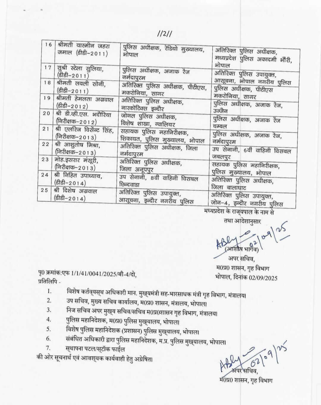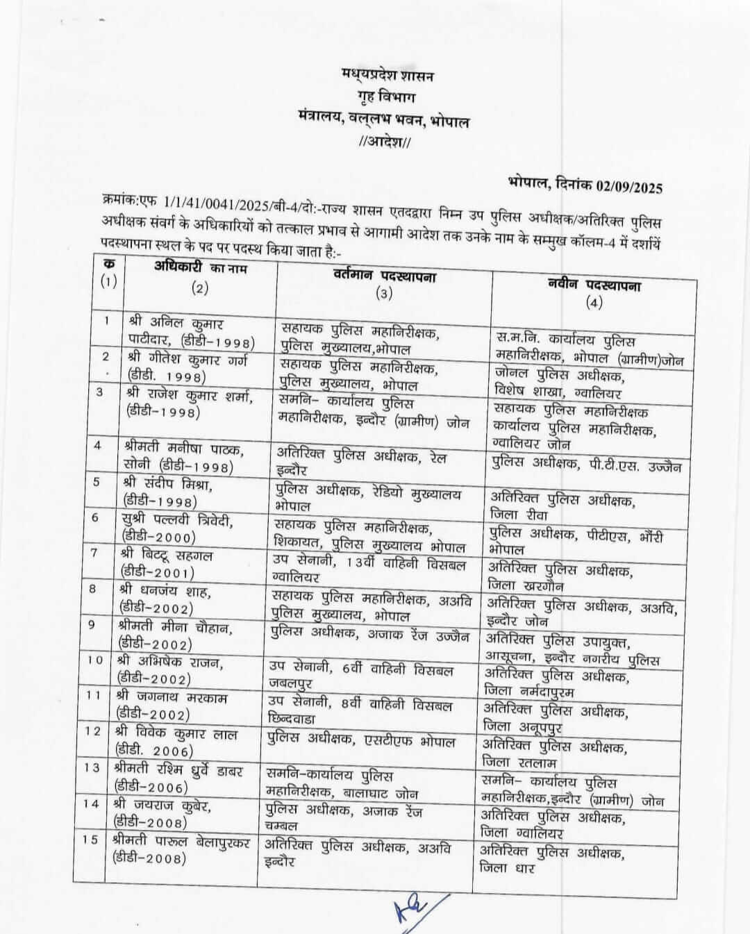 मध्य प्रदेश शासन गृह विभाग ने कानून व्यवस्था की दृष्टि से अधिकारियों की पदस्थापना में बदलाव किया है और उन्हें एक जगह से दूसरी जगह भेजा है, शासन द्वारा जारी तबादला आदेश में 25 वरिष्ठ पुलिस अधिकारियों के नाम शामिल हैं।
