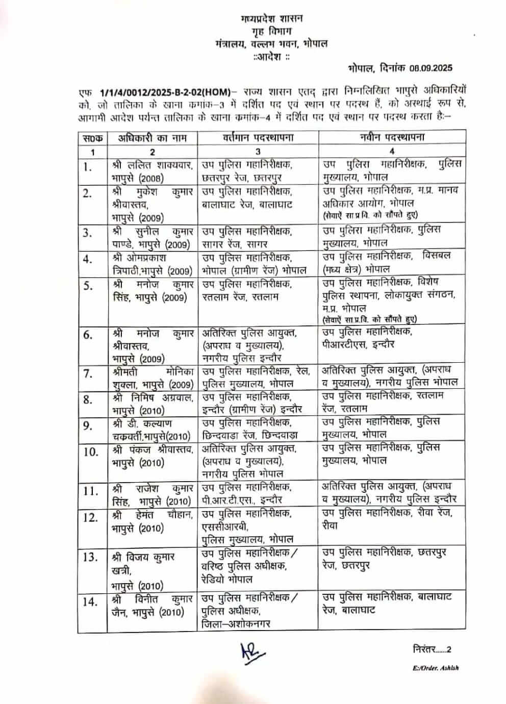 भारतीय पुलिस सेवा के अधिकारियों की तबादला सूची में DIG को एक रेंज से दूसरी रेंज में भेजा गया है लेकिन  पुलिस मुख्यालय भोपाल में सहायक पुलिस महानिरीक्षक (विशेष शाखा, जी) की जिम्मेदारी संभाल रहे मयंक अवस्थी को धार जिले का और पीएचक्यू में ही सहायक पुलिस महानिरीक्षक महिला सुरक्षा शाखा की जिम्मेदारी संभाल रहे राजीव कुमार मिश्रा को अशोकनगर का एसपी बनाया गया है।
