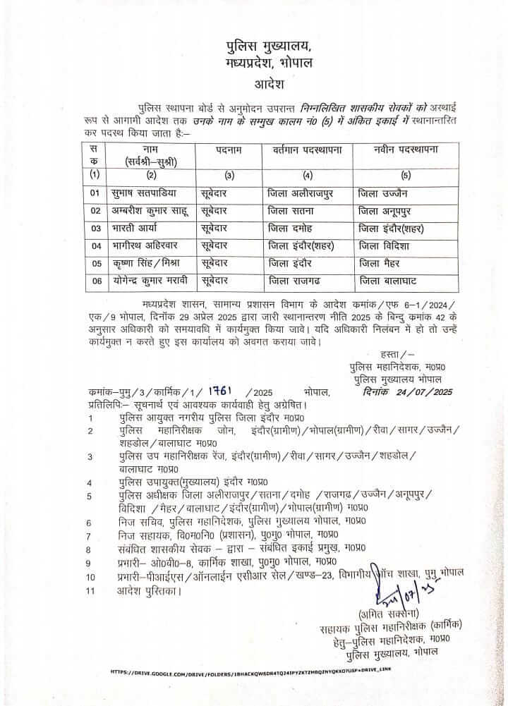 MP PHQ भोपाल ने तबादला आदेश जारी कर 6 सूबेदारों को नई जिम्मेदारी दी है, सहायक पुलिस महानिरीक्षक (कार्मिक) अमित सक्सेना के हस्ताक्षर से जारी आदेश में कहा गया है कि पुलिस स्थापना बोर्ड के अनुमोदन के बाद ये तबादले किये गए हैं।