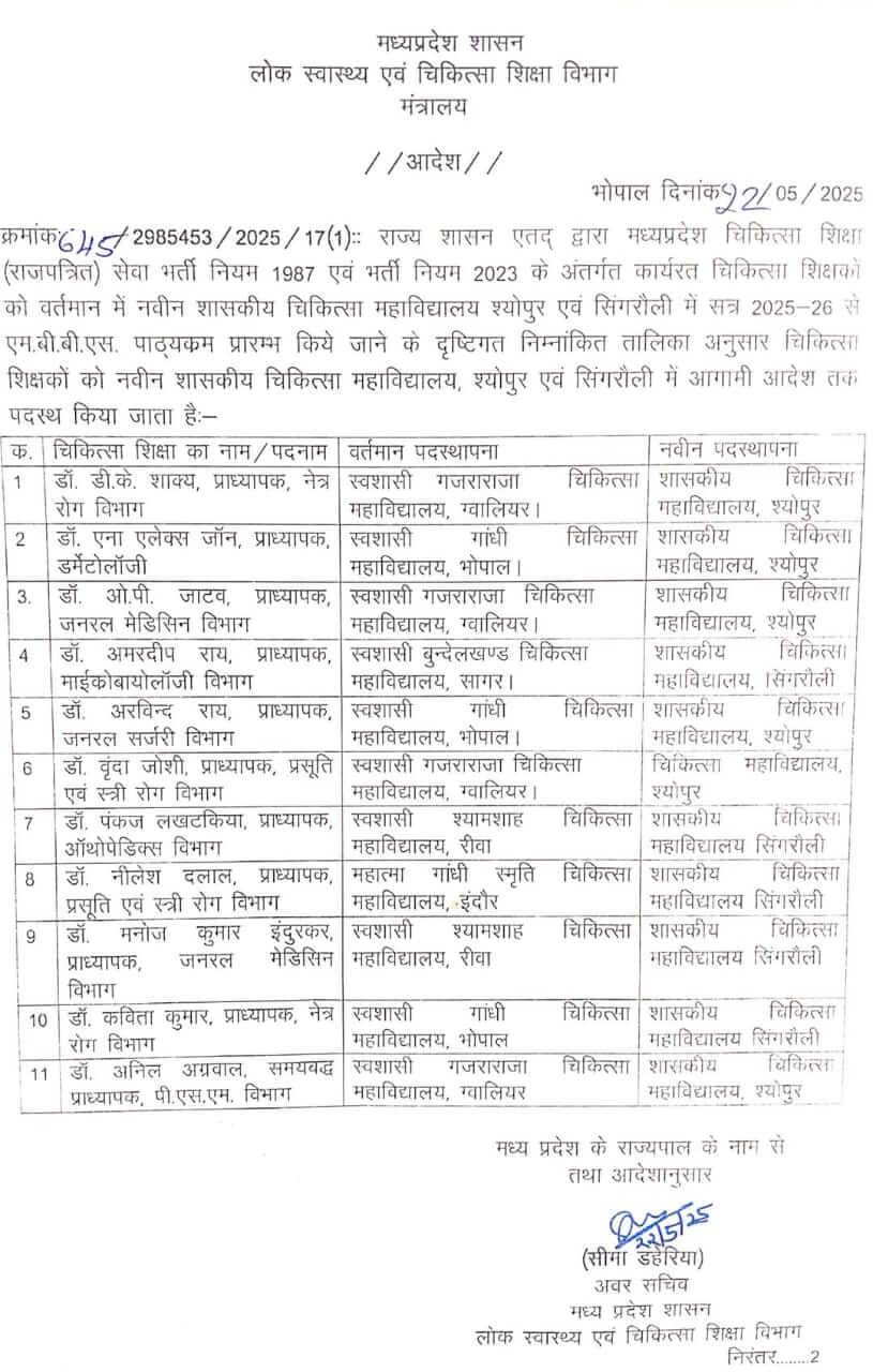 11 डॉक्टर्स को श्योपुर और सिंगरौली के नए मेडिकल कॉलेज में पदस्थ किया