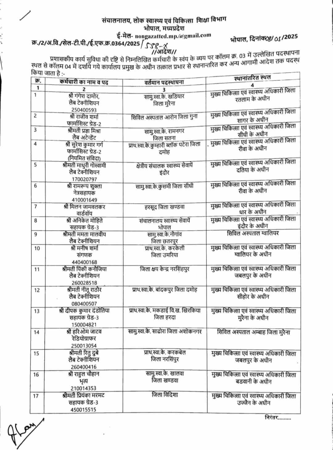 संचालनालय लोक स्वास्थ्य एवं चिकित्सा शिक्षा विभाग द्वारा जरी तबादला सूची में लैब टेक्नीशियन, फार्मासिस्ट, नेत्र सहायक, वार्ड बॉय, क्लर्क, कंप्यूटर ऑपरेटर, रेडियोग्राफर, भृत्य अदि शामिल हैं, इस लिस्ट में कुल 29 कर्मचारियों के नाम शामिल हैं जिन्हें एक जिले से दूसरे जिले में पदस्थ किया गया है।