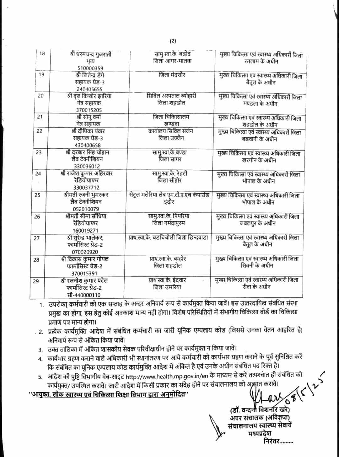 आदेश में निर्देश दिए गए हैं कि जिस कर्मचारी का तबादला हुआ है उसे एक सप्ताह के अन्दर अनिवार्य रूप से कार्यमुक्त किया जाए। ये उत्तरदायित्व संबंधित संस्था प्रमुख का होगा, इस हेतु कोई अवकाश मान्य नहीं होगा। विशेष परिस्थितियों में संभागीय चिकित्सा बोर्ड का चिकित्सा प्रमाण पत्र मान्य होगा।