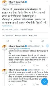 दरअसल शनिवार को ही कमलनाथ ने ट्वीट कर सीएम शिवराज पर निशाना साधा था। कमलनाथ ने ट्वीट कर लिखा था कि ‘जनता ने तो देश में कांग्रेस की सरकार बनाने का निर्णय किया था, लेकिन आपको जनता का निर्णय कहां शिरोधार्य हुआ? आपने सौदेबाजी से लोकतंत्र की हत्या कर जनादेश का अपमान कर बीच में ही कांग्रेस सरकार गिरा दी थी। आगे कमलनाथ ने लिखा, “इन 15 माह में हमने इन सब कामों के साथ ही प्रदेश की पहचान बदलने का काम भी किया। आपकी सरकार में प्रदेश के माथे पर लगे महिलाओं में अत्याचार में नंबर वन, किसानों की आत्महत्याओं में नंबर वन, बेरोजगारी में नंबर वन, भ्रष्टाचार में नंबर वन, मजदूरों के उत्पादन में नंबर वन, युवाओं की रोजगार के अभाव में आत्महत्या में नंबर वन प्रदेश के दाग को धोने का काम भी किया। प्रदेश की जनता इस सच्चाई को जानती है और उस जनता का अगला निर्णय भी हमें शिरोधार्य होगा।”