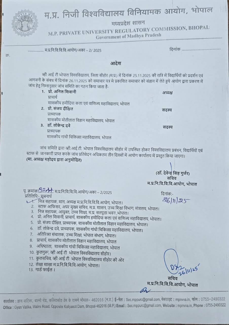 घटना के बाद निजी विश्वविद्यालय विनियामक आयोग ने घटना की जाँच के लिए तीन सदस्यीय कमेटी का गठन कर दिया है इसमें शासकीय हमीदिया कला एवं वाणिज्य महाविद्यालय भोपाल के प्राचार्य प्रोफ़ेसर अनिल शिवानी को अध्यक्ष बनाया गया है, शासकीय मोतीलाल विज्ञान महाविद्यालय भोपाल के प्रोफेसर संजय दीक्षित और शासकीय गांधी चिकित्सालय भोपाल के प्रोफ़ेसर डॉ लोकेन्द्र दवे को सदस्य बनाया गया है। ये समिति पूरे घटनाक्रम की जाँच कर तीन दिन में जाँच रिपोर्ट सौंपेगी।