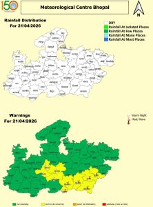 फिलहाल बुंदेलखंड और महाराष्ट्र की सीमा से सटे जिलों में लू का असर बना हुआ है। दिन रात के तापमान में बढ़ोतरी देखी जा रही है। मौसम विभाग ने 21 अप्रैल को भोपाल, सीहोर, रायसेन, नर्मदापुरम, छिंदवाड़ा, पांढुर्ना, सिवनी, मंडला और बालाघाट में ‘वार्म नाइट’ अलर्ट जारी किया है। बता दें कि जब रात का न्यूनतम तापमान सामान्य से 4.5 से 6.4 डिग्री ज्यादा हो और दिन का तापमान 40 डिग्री या उससे ऊपर रहे, तो उसे वॉर्म नाइट कहा जाता है। इधर, भीषण गर्मी को देखते हुए कई जिलों में स्कूलों के समय में बदलाव कर उन्हें सुबह जल्दी संचालित करने के निर्देश दिए गए हैं।