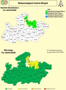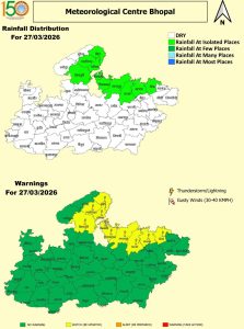 26 मार्च को एक नया पश्चिमी विक्षोभ सक्रिय होने जा रहा है जिसके प्रभाव से मध्य प्रदेश में फिर बादल छाएंगे और बारिश-आंधी की भी स्थिति बनेगी। फिलहाल दो दिन दिन में तेज धूप के साथ गर्मी और सुबह व रात में ठंडक बनी रहेगी। मंगलवार (24 मार्च 2026) को खंडवा और रतलाम में तापमान 38 °C के आसपास दर्ज किया गया। नर्मदापुरम, खरगोन व रायसेन में 37 °C तापमान रहा। पूर्वी व पश्चिमी हिस्से मेंबादल छाए रहे> भोपाल, इंदौर-उज्जैन संभाग में गर्मी का असर तेज रहा।