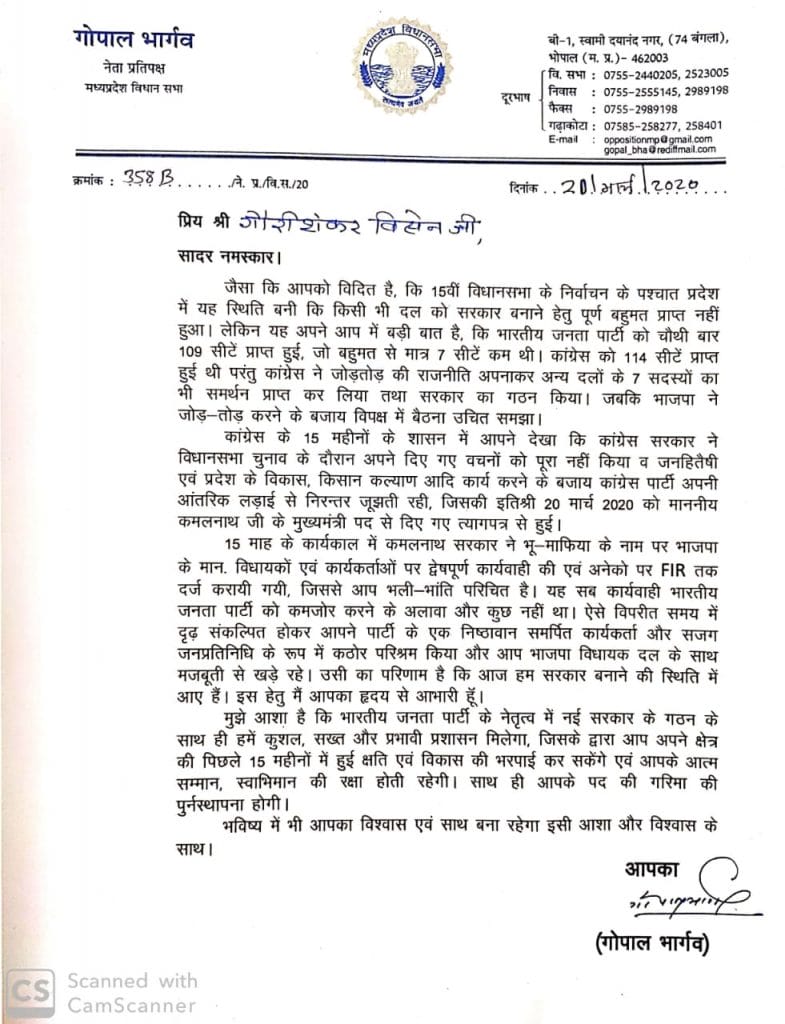 भोपाल। नेता प्रतिपक्ष गोपाल भार्गव ने बीजेपी के सभी विधायकों को एक पत्र लिखा है और इस पत्र के माध्यम से उन्होंने विधानसभा चुनावों में भाजपा की हार , उसके बाद कांग्रेस सरकार का गठन और कांग्रेस सरकार के गठन के बाद कमलनाथ सरकार द्वारा भू माफियाओं के नाम पर बीजेपी के कार्यकर्ताओं के ऊपर की गयी बदले की कार्रवाई का उल्लेख किया है। इसके साथ-साथ गोपाल भार्गव ने विधायकों को लिखा है कि इन विपरीत परिस्थितियों के बावजूद भी आप पार्टी के साथ खड़े रहे, यह अपने आप में बहुत काबिले तारीफ बात है।