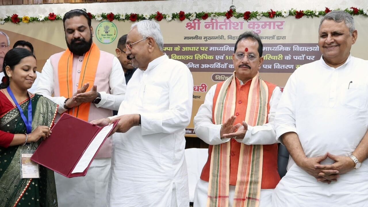 मुख्यमंत्री नीतीश कुमार ने 19 अगस्त, 2025 को अनुकंपा के आधार पर माध्यमिक और उच्च माध्यमिक विद्यालयों में नियुक्त होने वाले विद्यालय लिपिक और परिचारियों को नियुक्ति पत्र वितरित किया। यह कार्यक्रम मुख्यमंत्री सचिवालय में आयोजित किया गया। समारोह में पटना जिले के लाभार्थियों को नियुक्ति पत्र सौंपे गए। कुल 5353 लिपिक और परिचारियों को आज नियुक्ति पत्र प्रदान किए गए, जो लंबे समय से नौकरी की प्रतीक्षा कर रहे थे। नियुक्ति पत्र पाकर सभी लाभार्थी मुख्यमंत्री नीतीश कुमार का धन्यवाद कर रहे हैं।