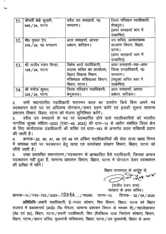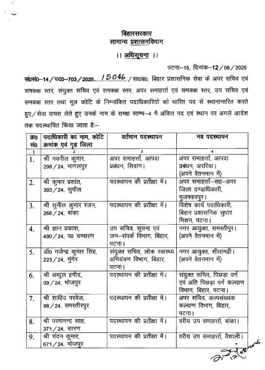 बिहार राज्य प्रशासनिक अधिकारियों का तबादला