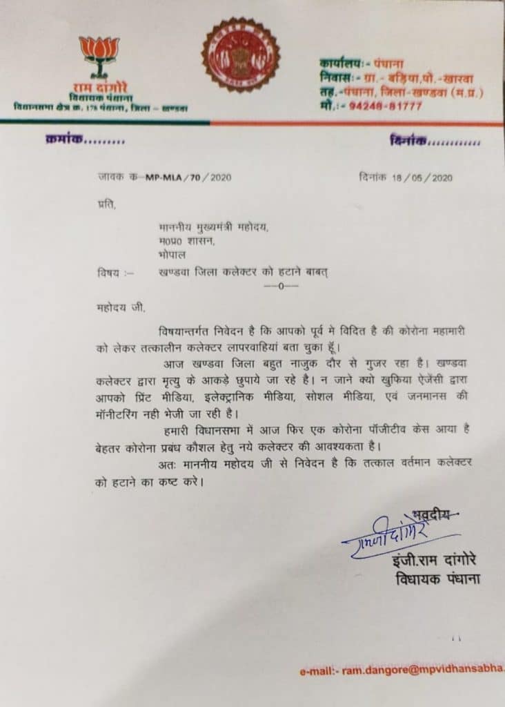 बीजेपी विधायक राम दांगोरे ने मुख्यमंत्री शिवराज सिंह चौहान को पत्र लिखकर खंडवा कलेक्टर तन्वी सुंद्रियाल को हटाने की मांग की है| उन्होंने पत्र में लिखा है कि आज खंडवा जिला बहुत नाजुक दौर से गुजर रहा है| खंडवा कलेक्टर द्वारा मृत्यु के आंकड़े छुपाए जा रहे हैं| ना जाने क्यों खुफिया एजेंसी द्वारा आपको प्रिंट मीडिया, सोशल मीडिया एवं जनमानस की मॉनिटरिंग नहीं भेजी जा रही है | उन्होंने लिखा हमारी विधानसभा में आज एक और कोरोना पॉजिटिव केस आया है| बेहतर कोरोना प्रबंध कौशल के लिए की नए कलेक्टर की आवश्यकता है|