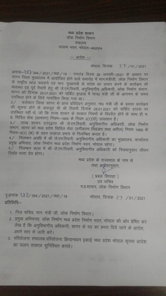 इस मामले में सागर कलेक्टर दीपक सिंह ने गणतंत्र दिवस के दिन ही दोनों अधिकारियों को नोटिस जारी किया था, जिसमे उन्होंने कहा था कि मंत्रीजी का कार्यक्रम पहले से निर्धारित था, प्रोटोकॉल के अनुसार विभाग के अधिकारियों को उनकी आगवानी के लिए उपस्थित होना था, लेकिन सर्किट हाउस में मंत्री के आगमन पर विभागीय अधिकारी उपस्थित नहीं थे, जो कि राज्य शासन के सत्कार नियम के विपरीत है| कलेक्टर द्वारा दोनों अधिकारियों को नोटिस जारी करने के बाद कार्यवाही के लिए प्रमुख सचिव को भी लिखा गया था| कलेक्टर के प्रतिवेदन पर प्रमुख सचिव ने तुरंत प्रभाव से दोनों अधिकारियों को निलंबित करने के आदेश जारी कर दिए|