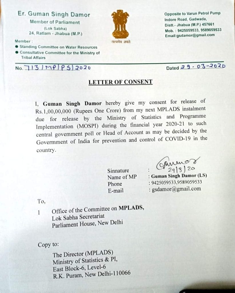 अलीराजपुर जिले के संसदीय क्षेत्र के सांसद रतलाम झाबुआ अलीराजपुर लोकसभा गुमानसिंह डामोर ने कोरोना वैश्चिक महामारी से देश में व्याप्त संकट से लड़ने के लिये प्रधानमंत्री के आह्वान पर प्रधानमंत्री राष्ट्रीय राहत कोष में सांसद निधि से 1 करोड़ रुपये दिये हैं। इसी के साथ उन्होने अपना एक माह का वेतन जो कि 1 लाख रूपये हैं, वो भी कोरोना सहायता के लिये प्रदान किया है।