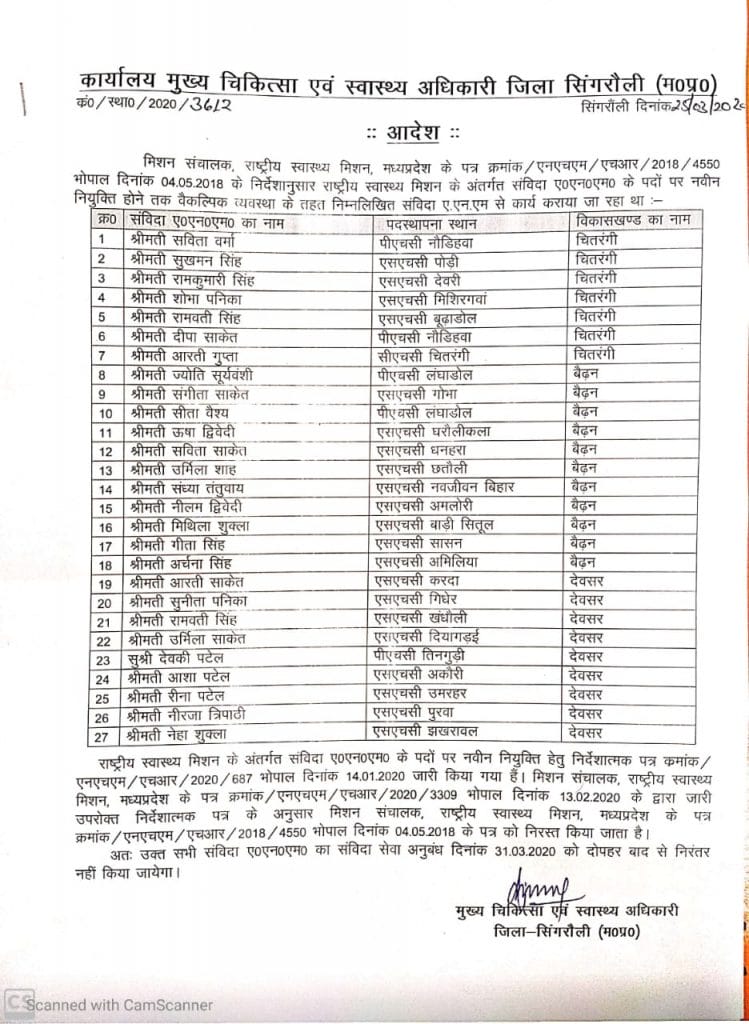 संविदा स्वास्थ्य कर्मचारी संघ मध्य प्रदेश के प्रांत अध्यक्ष सौरव सिंह चौहान ने मुख्यमंत्री, मिशन संचालक रीवा संभाग और सीएमएचओ जिला सिंगरौली से मांग करते हुए कहा है संविदा एएनएम की बर्खास्तगी एवं मात्र 3 महीने का निबंध बढ़ाने संबंधी आदेश को जितनी जल्दी हो सके निरस्त कर दिया जाए. जिससे समस्त संविदा स्वास्थ्य कर्मचारी चिंता मुक्त होकर इस महामारी को रोना से रोकथाम निदान और उपचार का कार्य सुचारू रूप से कर सकें।
