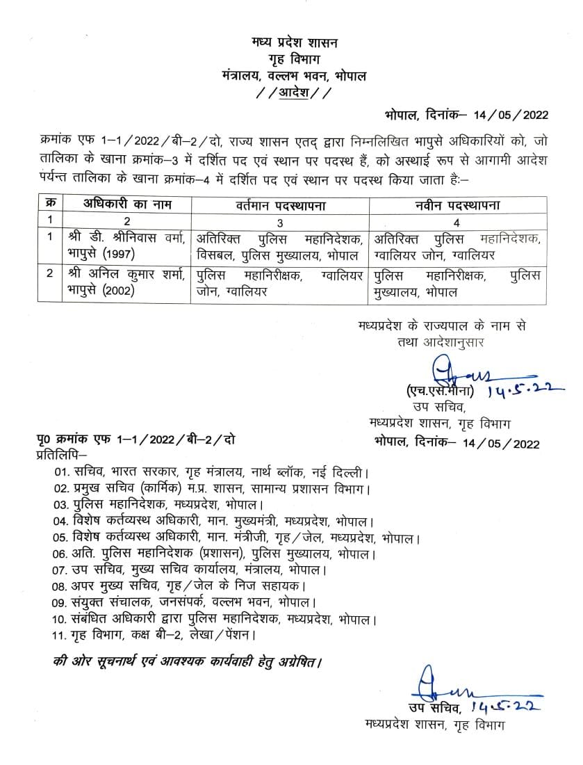 भोपाल, डेस्क रिपोर्ट।Guna Case. मध्य प्रदेश के गुना के आरोन में काले हिरण के शिकारियों से हुई मुठभेड़ में तीन पुलिसकर्मियों की गोली मारकर हत्या मामले में सीएम शिवराज सिंह चौहान ने बड़ी कार्रवाई की है। सीएम शिवराज सिंह चौहान ने ग्वालियर आईजी अनिल शर्मा को गुना प्रकरण में देरी से पहुंचने और लापरवाही बरतने पर तत्काल प्रभाव से हटाने का आदेश दिया है।वही श्रीनिवास शर्मा को ग्वालियर का नया आईजी बनाया गया है।