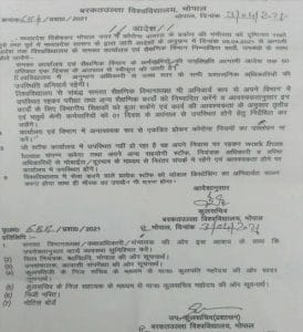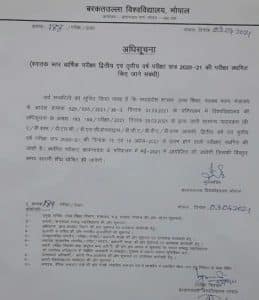 भोपाल, डेस्क रिपोर्ट। बरकतउल्ला विश्वविद्यालय (BU ) ने अपनी यूजी (UG) और पीजी (PG) की सेकंड व थर्ड ईयर की परीक्षाओं को स्थगित कर दिया है। इसके पीछे का कारण कोरोना बताया जा रहा है। मिली जानकारी के अनुसार यूनिवर्सिटी में एक साथ 17 कर्मचारियों की रिपोर्ट कॉरॉना पॉजिटिव आई है, जिसके बाद यूनिवर्सिटी द्वारा अधिसूचना जारी करते हुए यह जानकारी दी।