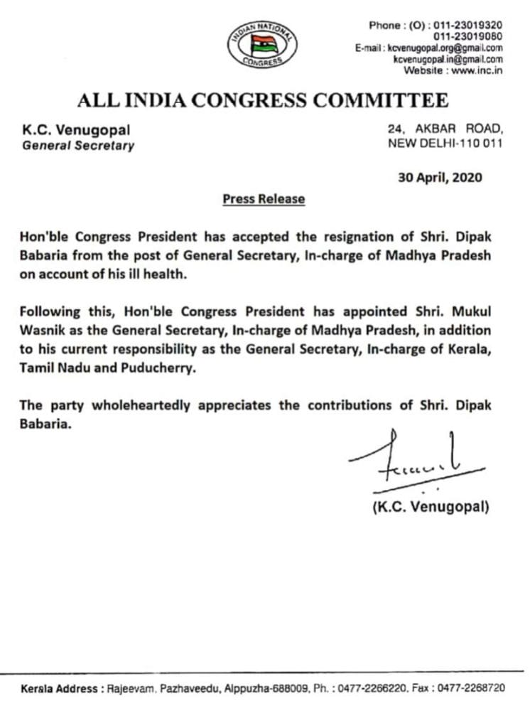 दीपक बावरिया ने मध्यप्रदेश कांग्रेस के प्रदेश प्रभारी के पद से इस्तीफा दे दिया है। पार्टी हाईकमान ने उनका इस्तीफा भी मंजूर कर लिया गया है। कांग्रेस पार्टी ने उनकी जगह मुकुल वासनिक को मध्यप्रदेश कांग्रेस का कार्यवाहक प्रभार सौंपा है। फिलहाल वासनिक केरल , तमिलनाडु और पंडुचेरी का प्रभार संभाले हुए है। इस्तीफे में बावरिया ने अपनी बीमारी का हवाला दिया है। पार्टी ने उनके अबतक के योगदान के लिए आभार जताया है। लेकिन सुत्रों की माने तो सिंधिया से नजदीकियों के चलते बावरिया को हटाया गया है। कांग्रेस के कार्यकर्ताओं और नेताओं में गलत मैसेज ना जाए इसलिए उनसे इस्तीफा देने को कहा गया।