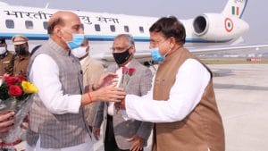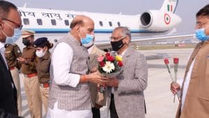 ग्वालियर, अतुल सक्सेना। उत्तर प्रदेश की योगी सरकार द्वारा झांसी में आयोजित तीन दिवसीय राष्ट्र रक्षा समर्पण “झांसी जलसा” पर्व के उद्घाटन समारोह में शामिल होने केंद्रीय रक्षा मंत्री राजनाथ सिंह (Rajnath Singh) बुधवार सुबह ट्रांजिट विजिट पर ग्वालियर(Gwalior News) के महाराजपुरा एयरबेस पहुंचे।