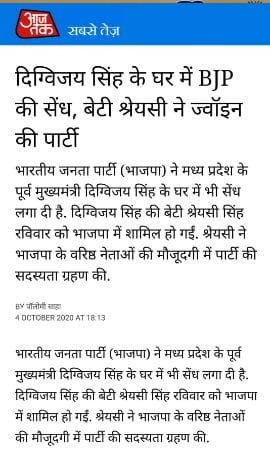 दरअसल, रविवार को इंटरनेशनल शूटर श्रेयसी सिंह (Shreyasi singh) भारतीय जनता पार्टी (BJP) में शामिल हो गईं। श्रेयसी पूर्व केंद्रीय मंत्री दिवंगत दिग्विजय सिंह (Digvijay Singh) की बेटी हैं। श्रेयसी ने दिल्ली में भाजपा की सदस्यता ली। उनके बिहार विधानसभा चुनाव (Bihar Election) में टिकट मिलने की चर्चा भी चर्चा चल रही है| बिहार से सम्बंधित इस घटनाक्रम को मध्य प्रदेश (Madhyapradesh) से जोड़ लिया गया| श्रेयसी के पिता और मध्य प्रदेश के पूर्व सीएम का नाम एक जैसा होने पर भ्रम की स्थिति बन गई| ‘आज तक ने तो अपने पोर्टल पर इसको लेकर खबर भी चला दी| जिसमे उन्होंने यह तक कहा कि दिग्विजय सिंह के घर में भाजपा ने सेंध लगा दी| जैसे ही यह खबर दिग्विजय सिंह तक पहुंची उन्होंने तत्काल इसको लेकर ट्वीट कर कहा कि श्रेयसी सिंह मेरी पुत्री नहीं हैं।