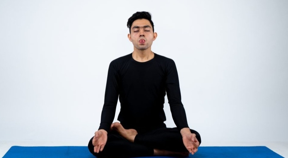 - एक बार बैठने के बाद अब शीतली प्राणायाम शुरू करना है। इस आसन के लिए अपनी जीभ को मुंह से बाहर निकालें।
