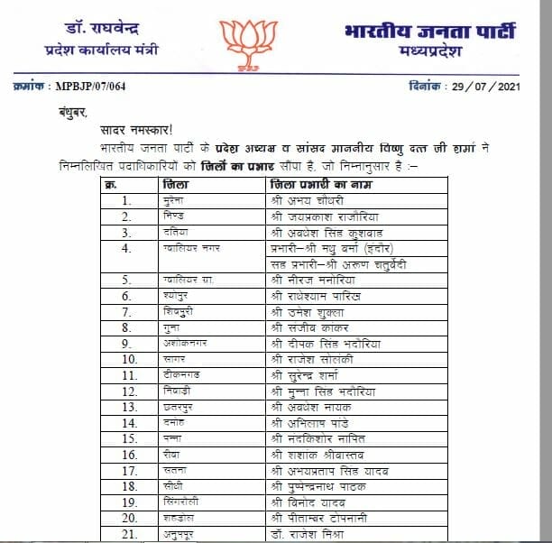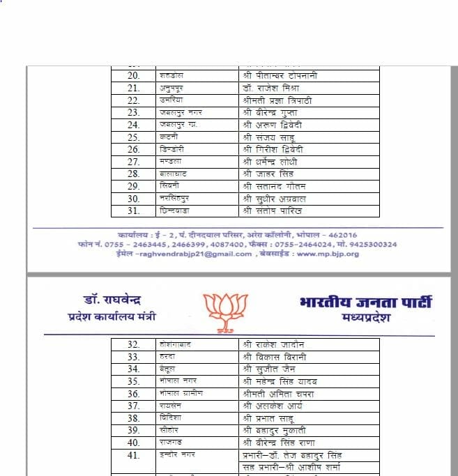 भोपाल, डेस्क रिपोर्ट। आगामी उप चुनावों (Upcoming By-election) से पहले मध्य प्रदेश बीजेपी (MP BJP) ने प्रदेश पदाधिकारियों को जिलों के प्रभार सौंपे दिए है। इसमें 57 प्रदेश पदाधिकारियों को बीजेपी प्रदेश अध्यक्ष वीडी शर्मा (VD Sharma) जिलों का प्रभार सौंपा है।इस संबंध में प्रदेश कार्यालय मंत्री राघवेंद्र ने लिस्ट जारी कर दी है।