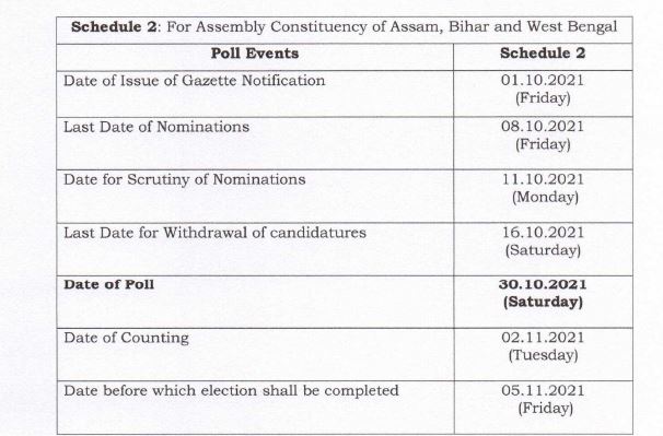 मध्यप्रदेश की खंडवा लोकसभा और पृथ्वीपुर, जोबट एवं रैगांव विधानसभा के लिये 30 अक्तूबर 2021 को मतदान एवं 2 नवंबर 2021 को मतगणना होगी।