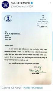 — ANIL DESHMUKH (@AnilDeshmukhNCP) April 5, 2021