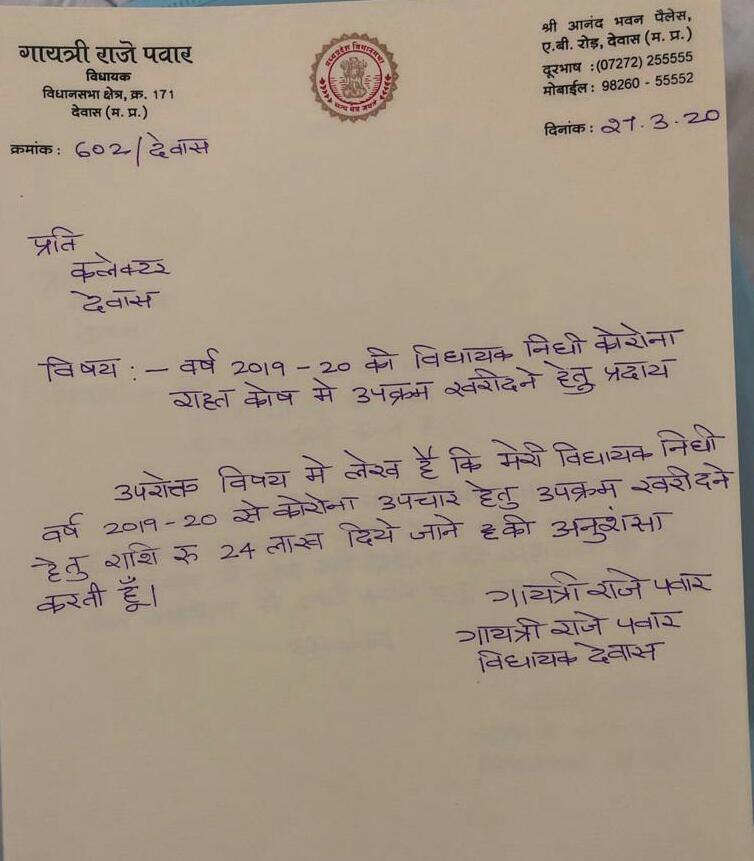 देवास/अमिताभ शुक्ला। देवास विधायक गायत्री राजे पवार ने विधायक निधी से कोरोना राहत के लिये 24 लाख की सहायता की है। अपनी विधायक निधी से विधायक गायत्री राजे पवार ने 24 लाख रूपये की राशि कोरोना उपचार हेतु दवाओं, मास्क, सैनेटाइजर व अन्य आवश्यक वस्तुओं की खरीद के लिए दी है। बता दें कि गायत्री राजे पवांर देवास विधानसभा से BJP हैं।