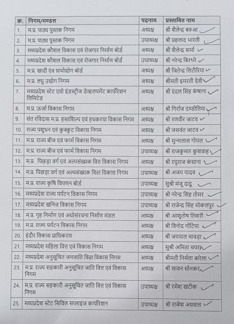 भोपाल, डेस्क रिपोर्ट। लंबे समय से चल रही चर्चाओं के बीच एक बड़ी खबर खुलकर सामने आ रही है। दरअसल मध्य प्रदेश निगम मंडल (Madhya Pradesh Corporation Board) में नियुक्तियां (appointment) की जा रही है। इन नियुक्तियों में प्रमुख चेहरों को जगह मिली है। जिन्हें बड़ी जिम्मेदारी सौंपी गई है।