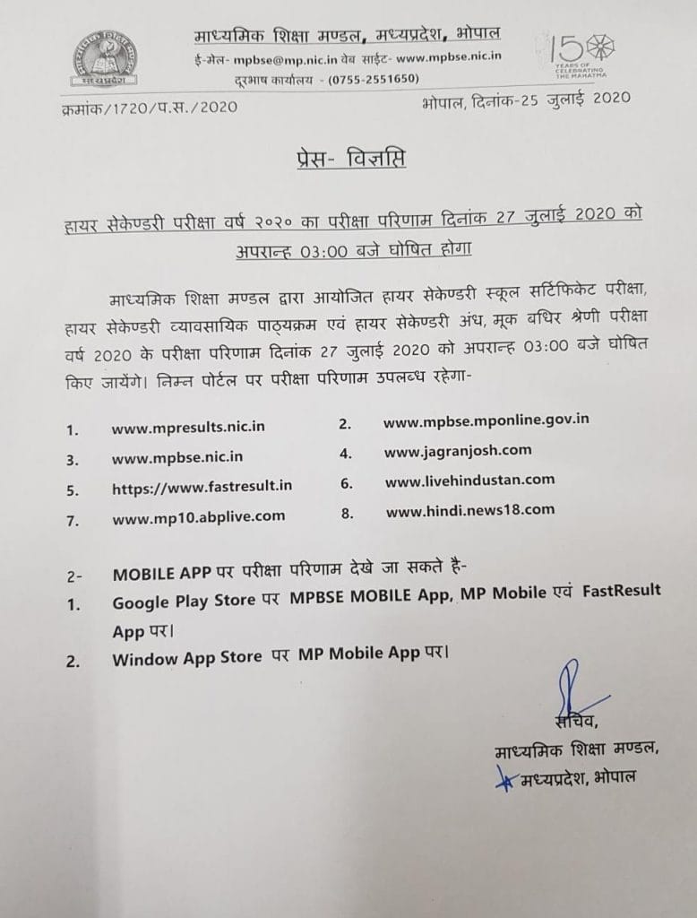 रिजल्ट जारी होने के बाद स्टूडेंट्स बोर्ड की वेबसाइट mpresults.nic.in पर अपना परीक्षा परिणाम देख सकते हैं| इससे पहले 4 जुलाई को 10वीं का रिजल्ट घोषित किया गया था। 30 साल बाद पहली बार ऐसा हो रहा है जब 10वीं के नतीजे 12वीं से पहले घोषित किए गए। कोरोना वायरस और लॉकडाउन के कारण 10वीं के दो पेपर और 12वीं के कुछ पेपर शेष रहे गए थे। जिसके बाद सरकार 10वीं की परीक्षाएं रद्द करने का फैसला किया था। वहीं 12वीं की शेष परीक्षाएं 9 जून से 16 जून तक चली थीं।