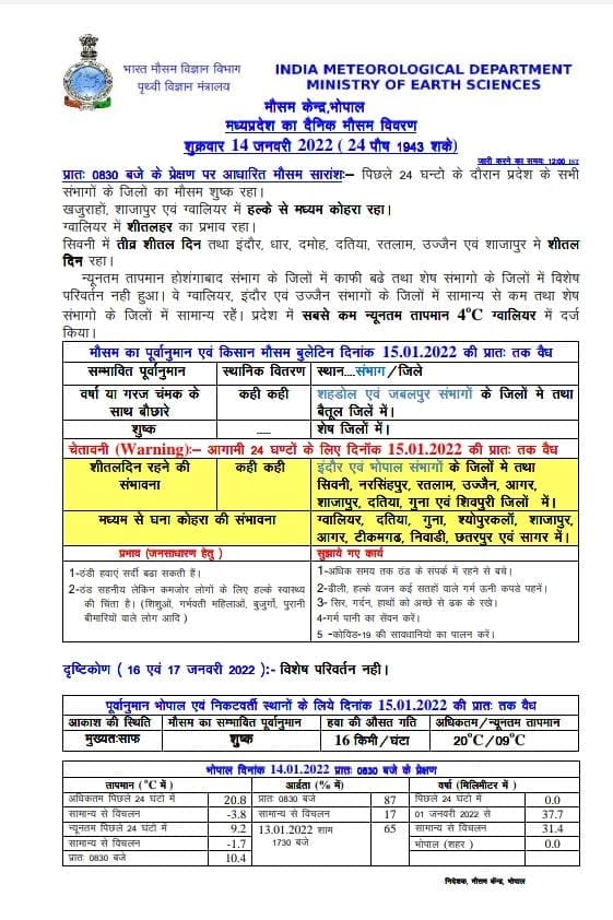 मौसम विभाग का कहना है कि 17 जनवरी से वातावरण में नमी जाएगी साथ ही बादल छाने की प्रक्रिया भी शुरू होगी। इसके साथ ही एक बार फिर से रात के तापमान में गिरावट देखने को मिलेगी। गुरुवार को शिवनी में Cold Day का येलो अलर्ट जारी किया गया है। इसके अलावा शाजापुर, उज्जैन, रतलाम, इंदौर, धार और बैतूल जिले में भी लोगों को ठंड और शीतलहर से बचे रहने की सलाह दी जा रही है।