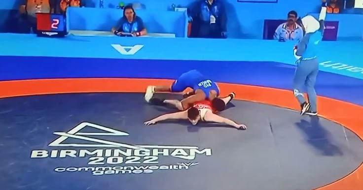 🇮🇳’s Dhakad youth wrestler Naveen (M-74kg) defeats 🇵🇰’s Tahir by points (9-0) en route to winning GOLD 🥇on his debut at #CommonwealthGames 🔥