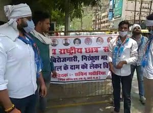 बढ़ती बेरोजगारी, महंगाई और पेट्रोल डीजल के रोज बढ़ते दामों को लेकर कांग्रेस के छात्र संगठन भारतीय राष्ट्रीय छात्र संगठन NSUI ने आज सोमवार को ग्वालियर में प्रदर्शन किया। प्रदेश सचिव सचिन भदौरिया के नेतृत्व में छात्र नेताओं ने पड़ाव क्षेत्र में प्रदर्शन किया। प्रदर्शन के दौरान NSUI प्रदेश सचिव सचिन भदौरिया और कुछ अन्य छात्र नेताओं एक पेड़ के सहारे नायलोन की रस्सी गले में डाल ली। मौके पर पहुंची पुलिस ने छात्रनेताओं से रस्सी छीन लिया। कार्यकर्ताओं के कहने पर पुलिस ने उन्हें गिरफ्तार कर लिया।