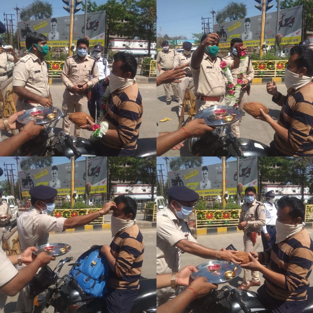 रीवा जिले में लॉक डाउन का उल्लंघन करने वाले लोगों का आज फूल माला व तिलक से स्वागत किया गया है। दरअसल यह इसलिए किया गया क्योंकि प्रशासन के हजार कोशिशों के बावजूद भी लोग सड़कों पर घूमते नजर आ रहे हैं। यह कार्यवाही पूरे जिले में एक साथ शुरू की गई है। जिससे शायद लोगों को पुलिस की इस पहल से कुछ समझ आए और लोग अपनी व अपने परिवार एवं समाज के प्रति अपनी जिम्मेदारी समझें। इस दौरान रीवा पुलिस अधीक्षक आबिद खान एवं एडिशनल एसपी शिव कुमार वर्मा व डीएसपी यातायात मनोज वर्मा द्वारा लोगों की फूल माला देकर आरती उतारी गई।