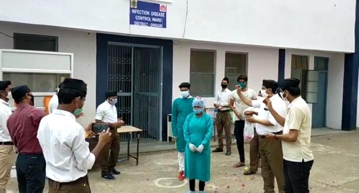 इसी कड़ी में डिंडोरी जिला मुख्यालय में शनिवार की सुबह राष्ट्रीय स्वयं सेवक संघ की जिला इकाई के सदस्यों ने कोरोना जैसी महामारी से अपने देशवासियों को बचाने के लिए लड़ रहे इन जांबाज अधिकारी और कर्मचारियों का पुष्प वर्षा कर स्वागत किया। आर एस एस के कार्यकर्ता नगर के विभिन्न स्थानों पर ड्यूटी पर तैनात पुलिस कर्मियों के पास पहुंचे और फूलों की वर्षा करते हुए उनका अभिनंदन किया साथ ही उनकी कर्तब्यनिष्ठा के लिए आभार प्रकट किया। इसी तरह जिला चिकित्सालय पहुंचकर आकस्मिक सेवा में उपस्थित डॉक्टर एवं नर्सिंग स्टाफ एव विभाग के अमले को भी फूल भेंटकर विषम परिस्थितियों में लगातार अपनी सेवाएं देने के लिए उनका धन्यवाद ज्ञापित किया। आर एस एस डिण्डोरी के नगर प्रमुख ने कहा कि सच्चे जांबाज कोरोना योद्धाओं का सम्मान करते हुए हम गौरव महसूस कर रहे हैं।