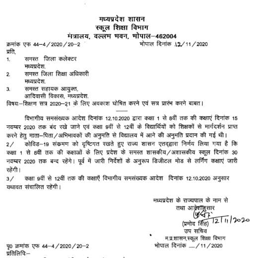 दरअसल, केंद्र की गाइड लाइन के बाद मध्यप्रदेश स्कूल शिक्षा विभाग ने कक्षा 1 से 8 तक के स्कूल 15 नवंबर तक पूरी तरह बंद रखने के आदेश जारी किये थे| 15 नवंवर के बाद स्कूल खोलने पर विचार किये जाने की चर्चा थी| लेकिन अब 30 नवंबर तक स्कूल बंद रहेंगे| गुरूवार शाम को स्कूल शिक्षा विभाग ने इस संबंध में आदेश जारी किये हैं|
