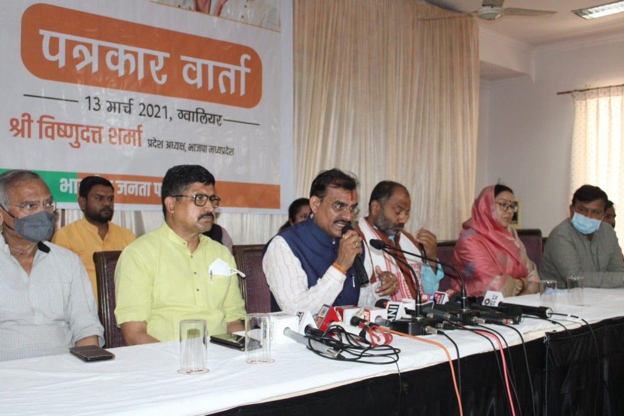 ग्वालियर, अतुल सक्सेना। भारतीय जनता पार्टी (BJP) के प्रदेशाध्यक्ष विष्णुदत्त शर्मा (VD Sharma) ने कहा कि भारतीय जनता पार्टी (BJP) हमेशा से ही विकास की राजनीति करती है। झूठे नारियल फोड़ना हमारे संस्कार में नहीं है। कमल नाथ (Kamal Nath) अगर यह कह रहे हैं कि मुख्यमंत्री शिवराज सिंह चौहान (CM Shivraj Singh Chauhan) झूठे नारियल फोड़ते हैं तो उन्हें जनता ने उपचुनाव के दौरान अच्छी तरह से बता दिया है कि झूठे नारियल किसने फोड़े और सच्चे किसने। उन्होंने दावा किया कि नगरीय निकाय चुनावों में भारतीय जनता पार्टी (BJP) गुजरात की तरह मप्र में भी इतिहास बनाएगी।