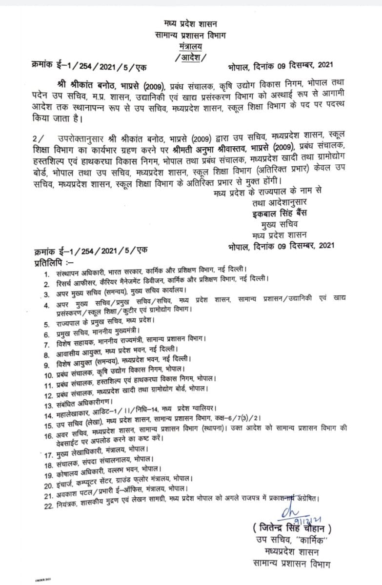 इकबाल सिंह बैस के हस्ताक्षर से जारी आदेश में 2009 बैच के भारतीय प्रशासनिक सेवा के अधिकारी श्रीकांत बनोठ और 2009 बैच की ही भारतीय प्रशासनिक सेवा की अधिकारी अनुभा श्रीवास्तव की जिम्मेदारियों में बदलाव किया है। यहाँ देखें लिस्ट।