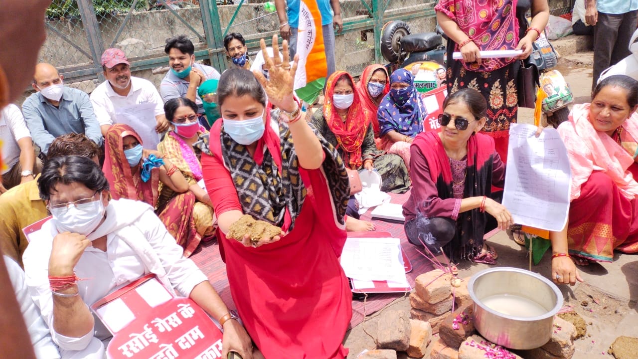 महिलाओं ने सड़क पर लकड़ी से चूल्हा जलाया और हाथों से गोबर के कंडे बनाकर महिला कांग्रेस ने कहा कि प्रधानमंत्री नरेंद्र मोदी ने उज्ज्वला योजना लागू कर कहा था कि हमारी सरकार ने घर घर रसोई गैस पहुंचा दी है अब किसी भी बहन की आंखों में आंसू नहीं आएंगे लेकिन अब वही मोदी सरकार रसोई गैस की कीमत बढ़ाकर महिलाओं को खून के आंसू रुला रही है।