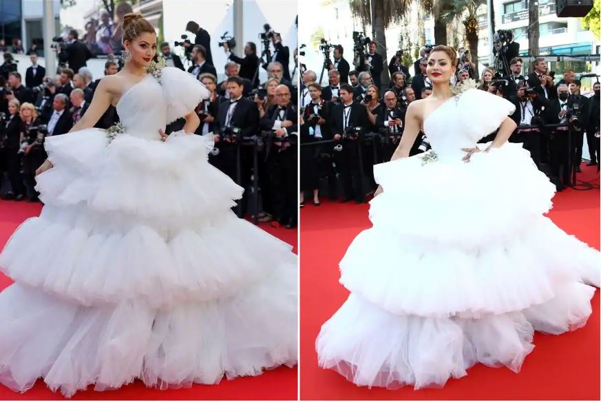 व्हाइट वन ऑफ शोल्डर रफल गाउन में उर्वशी किसी शहजादी से कम नहीं लग रही है। एक्ट्रेस ने अपने रेड कारपेट लुक को स्टाइलिश ईयर रिंग्स और ब्रेसलेट के साथ पेयर किया।