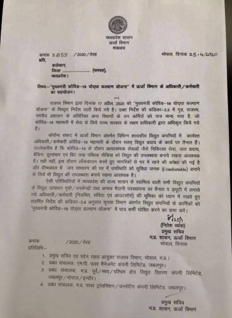 दरअसल, प्रमुख सचिव ऊर्जा नितेश व्यास ने सभी कलेक्टरों को पत्र भेजकर कहा है कि ऊर्जा विभाग के अधिकारियों और कर्मचारियों को भी ‘मुख्यमंत्री कोविड-19 योद्धा कल्याण योजना’ में शामिल किया जाए। उन्होंने कहा है कि राज्य शासन के स्वामित्व वाली सभी विद्युत कम्पनियों के विद्युत उत्पादन गृहों, उप केन्द्रों और अन्यत्र मैदानी पदस्थापना पर तैनात एवं ड्यूटी में लगाये गए अधिकारियों-कर्मचारियों (नियमित, संविदा तथा आउटसोर्स) की भूमिका को ध्यान में रखते हुए उन्हें मुख्यमंत्री कोविड-19 योद्धा कल्याण योजना में शामिल करें। योजना के निर्देशों में इस तरह का प्रावधान (कंडिका-3.4) है।